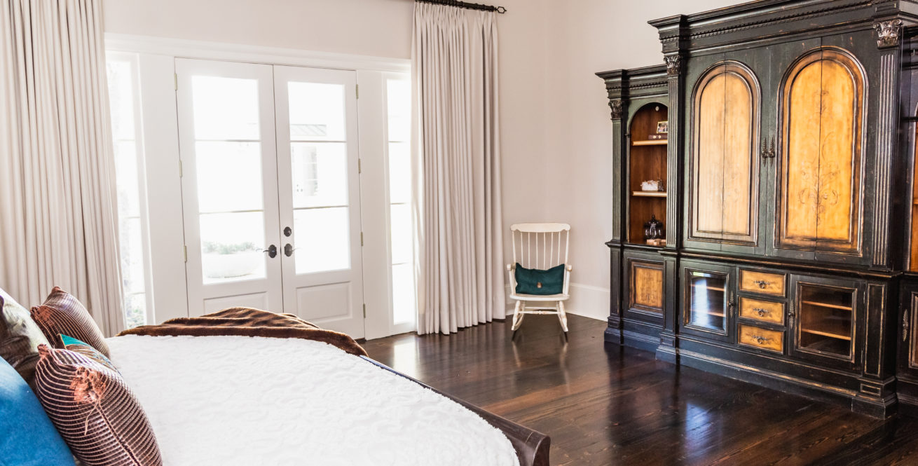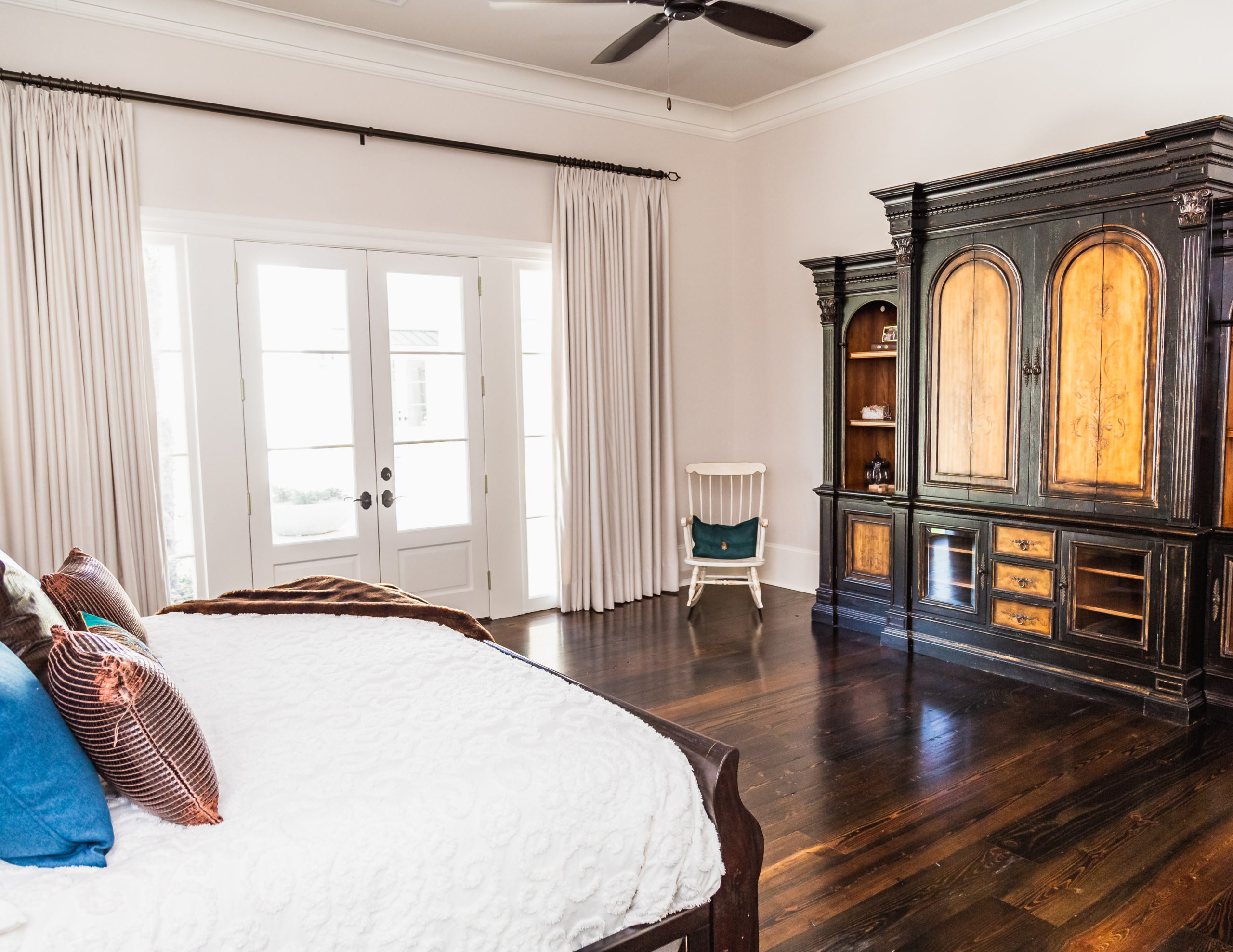 - Custom bookcase opens to hidden closet